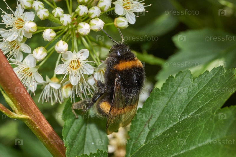 Шмель собирает пыльцу и нектар с цветков куста спиреи