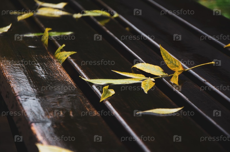 Упавшие листья на мокрой скамейке, fallen leaves on a wet bench