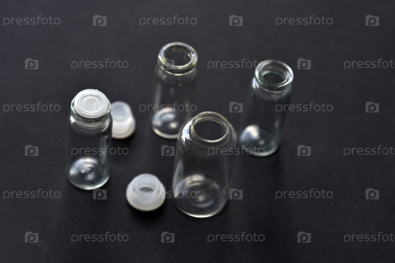Стеклянные пустые бутылки на черном фоне крупным планом. Аптечные бутылки днем в группе