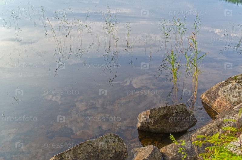 Отражение неба в водной поверхности в редких зарослях тростника. Река Писта, северная Карелия, август