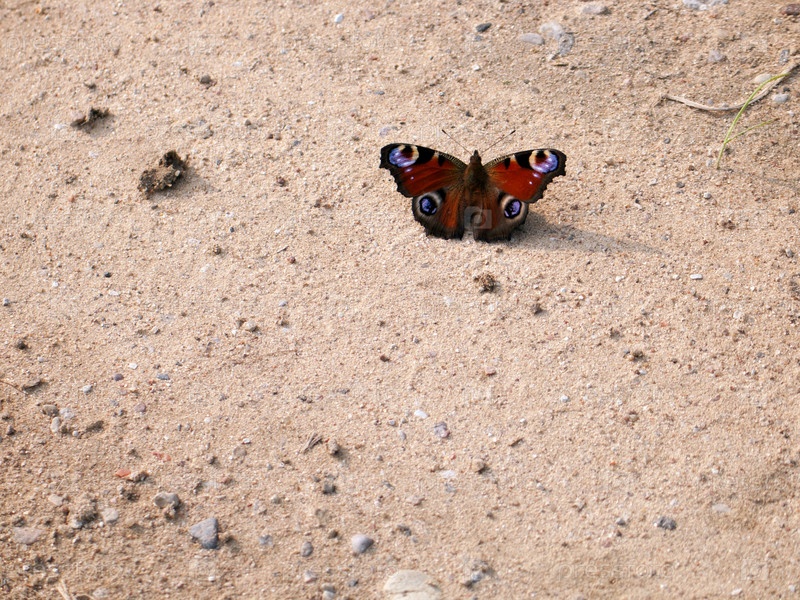 Красивая цветная бабочка сидит на песке с распростертыми крыльями