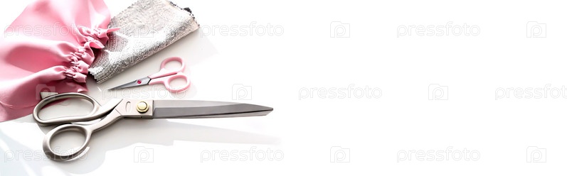 Баннер: лоскуты ткани с разной фактурой на белом фоне крупным планом, рядом портновские ножницы