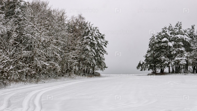 Снежные шапки на соснах и елях в пасмурный зимний день