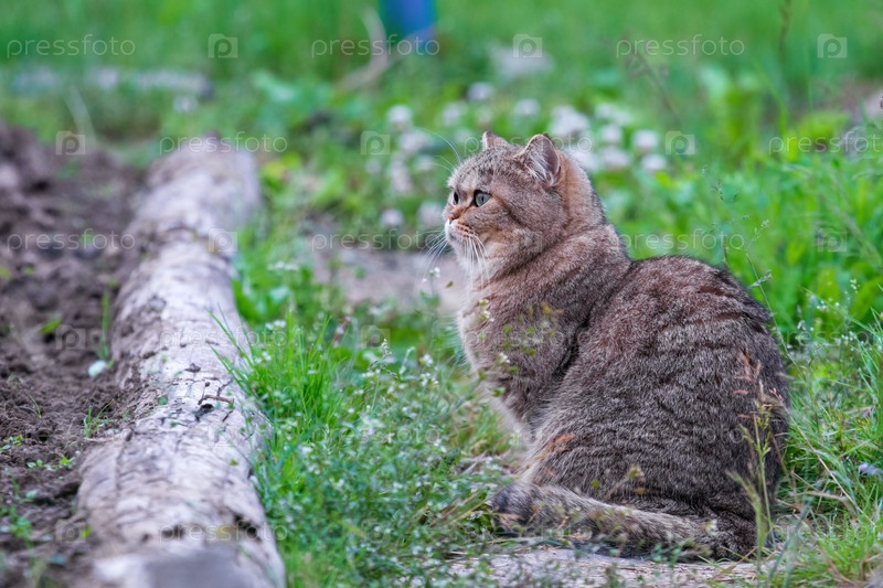 Красивая кошка гуляет одна по саду на природе. Профиль просмотр