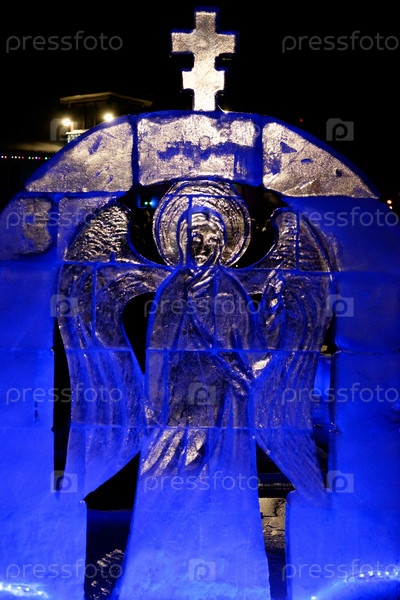 Ледяная скульптура. Ангел с крыльями. Праздник Богоявления. Люди купаются в проруби. Вертикальный