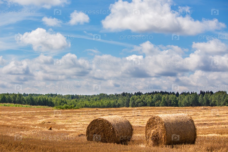 Скошенные снопы сена на фоне убранного поля, леса и голубого неба с облаками