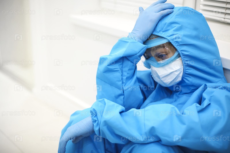 Уставшая депрессивная медсестра в средствах индивидуальной защиты СИЗ после тяжелой смены во время Covid-19