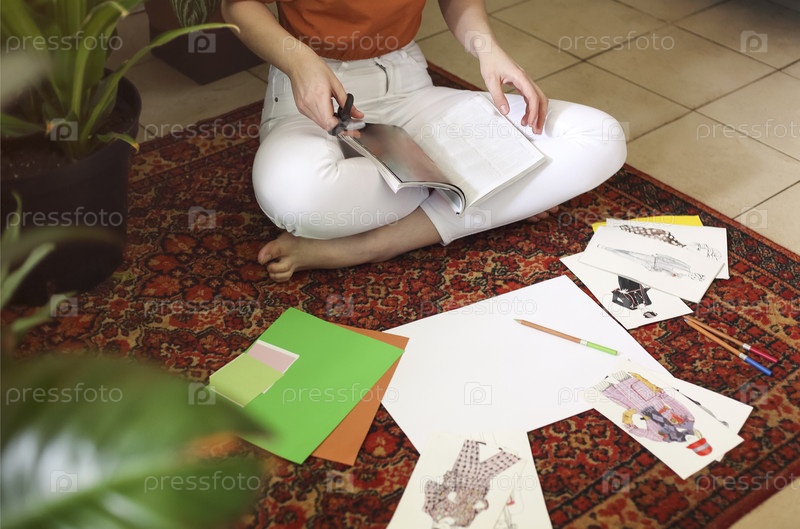 Молодая женщина создает свое желание фэн-шуй, сидя на ковре в комнате в стиле бохо
