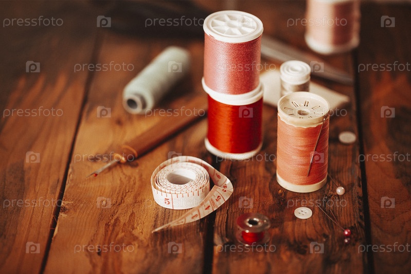 Швейные принадлежности на деревянном столе