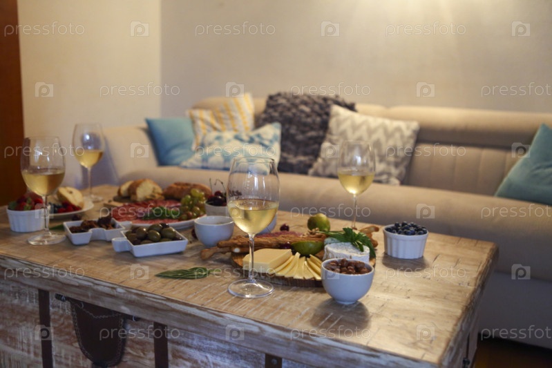 Деревянный стол с белым вином и разнообразными вкусными закусками из сыра и оливок в гостиной