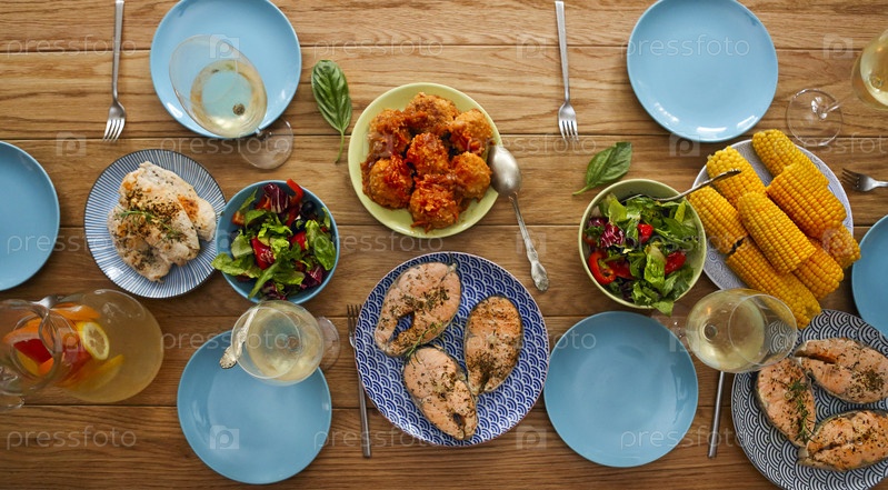 Сверху подают вкусные рыбные стейки и разные овощи с салатами на деревянном столе
