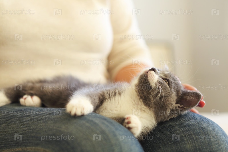 Симпатичный серый и белый котенок сидит на коленях у женщины