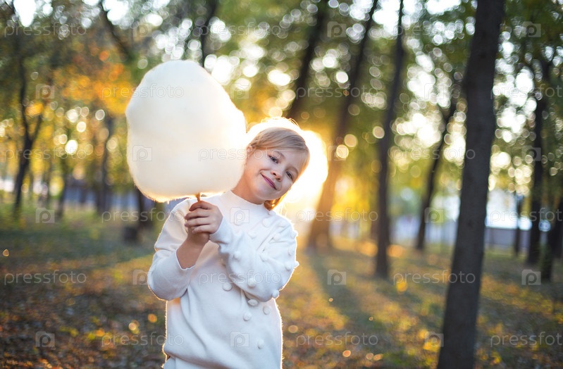 Маленькая милая девочка с сахарной ватой на фоне осеннего парка. Веселимся и позируем