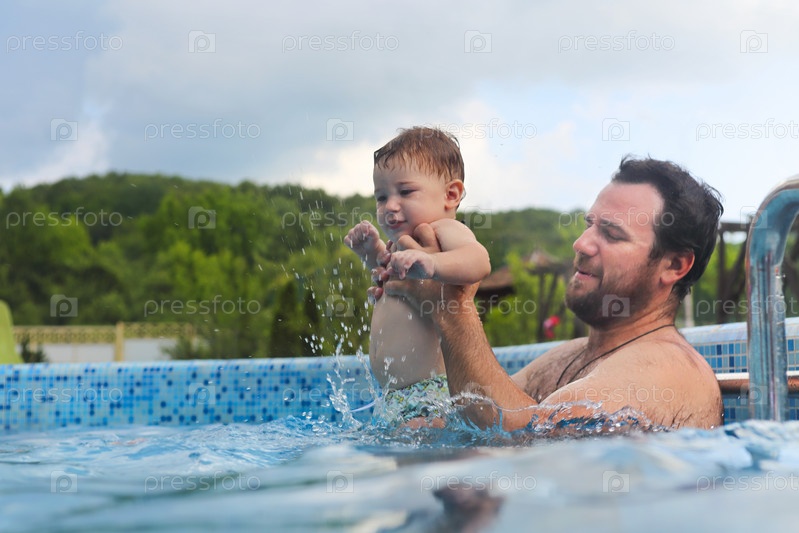 Отец учит маленького ребенка плавать в бассейне
