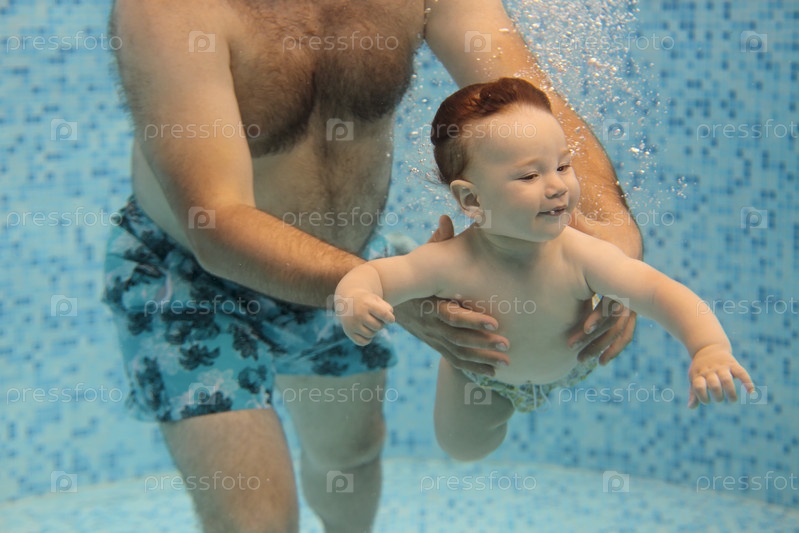 Отец учит маленького ребенка плавать под водой в бассейне