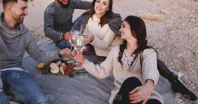 Счастливые друзья вместе празднуют особое событие на пляже в выходные