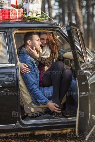 Счастливая пара в старинном автомобиле с подарками на крыше