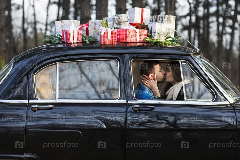 Счастливая пара в старинном автомобиле с подарками на крыше