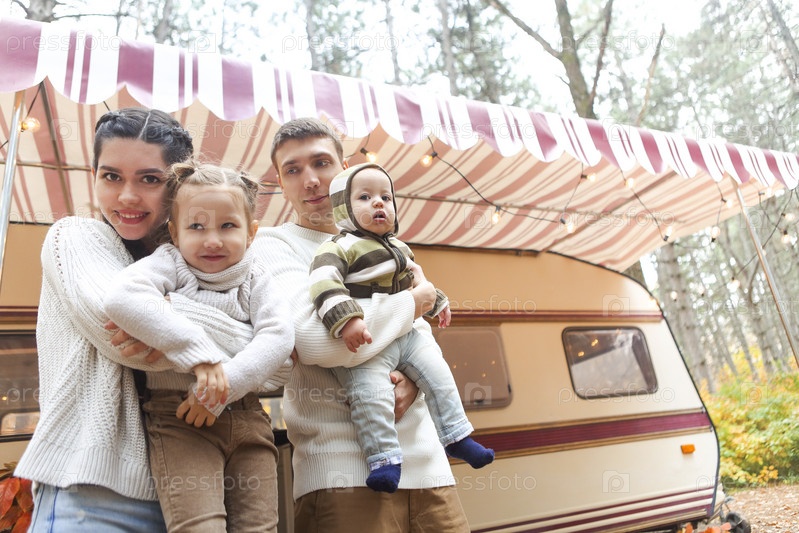 Портрет молодой улыбающейся семьи, обнимающейся возле дома на колесах