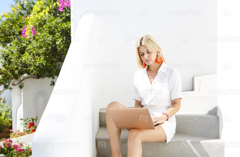 Молодая женщина в белых нарядах сидит на ступеньках отеля и пользуется ноутбуком при солнечном свете
