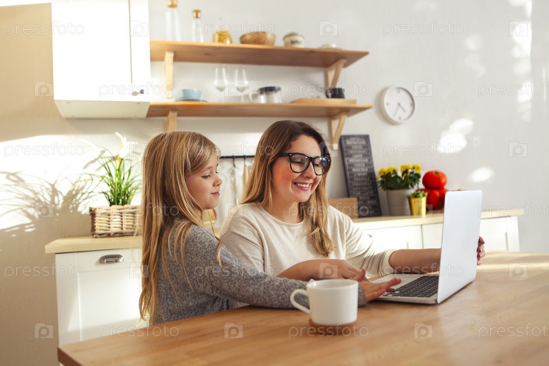 Мать с маленькой девочкой, использующей ноутбук на кухне