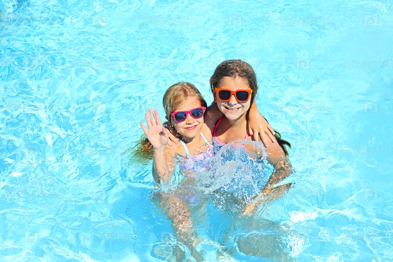 Две милые девушки играют в бассейне