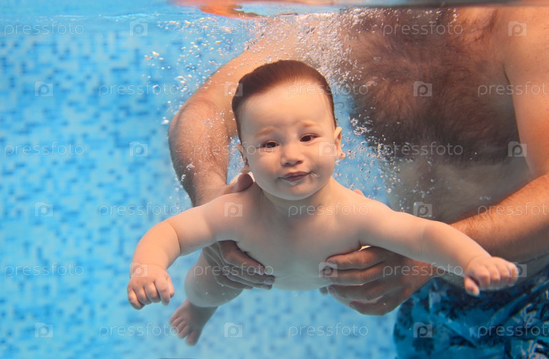 Отец учит маленького ребенка плавать под водой в бассейне