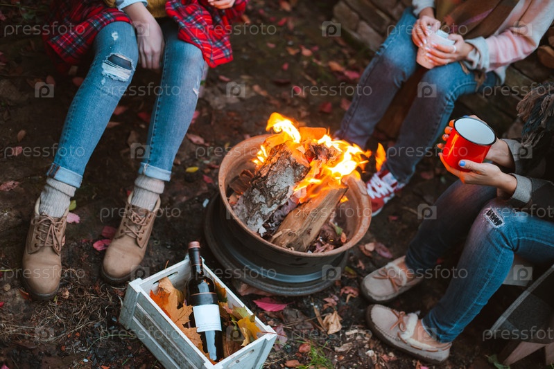 Трое друзей уютно отдыхают и пьют вино осенним вечером на свежем воздухе у костра на заднем дворе