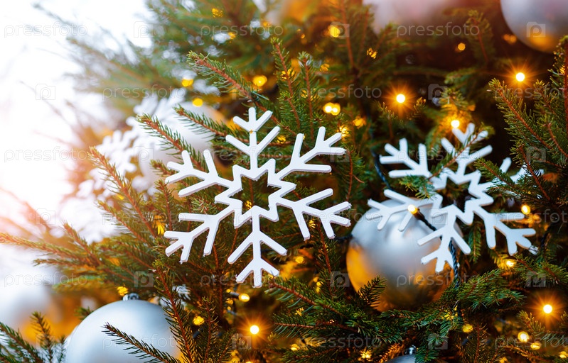 Новый год. Снежинка, фон, огни, свободное пространство Размытие, мягкий фокус, украшенная елка
