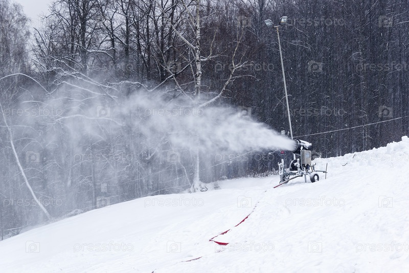 Снежная пушка на горнолыжном склоне. Горнолыжный комплекс Узкое на Севастопольском проспекте, Москва. Декабрь