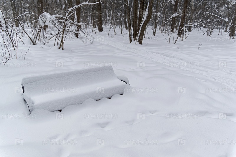 Зимний пейзаж. Заснеженная лавочка в лесу. Москва, Битцевский лес, январь
