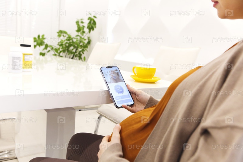 Обрезанное фото беременной женщины со смартфоном с помощью приложения для отслеживания беременности
