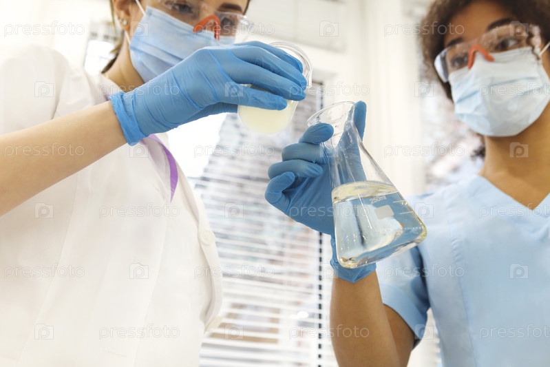 Два ученых-медиков в масках для лица работают с пробирками в лаборатории