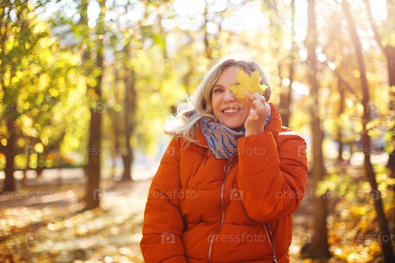 Веселая женщина в осеннем парке