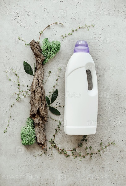 Композиция с бутылкой стирального порошка из коры дерева, крошечных мхов и травы на светлом бетонном фоне
