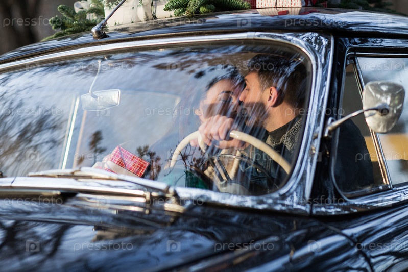 Счастливая пара в старинном автомобиле с подарками на крыше
