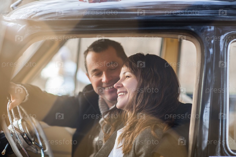 Счастливая пара в старинном автомобиле с подарками на крыше