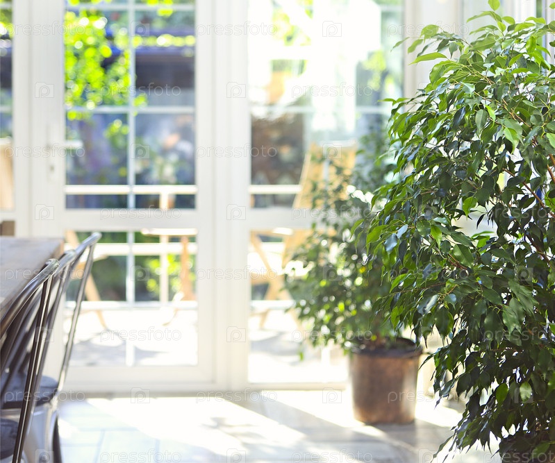 Пышное растущее зеленое растение внутри залитой солнцем столовой с размытым фоном стеклянного дверного проема террасы