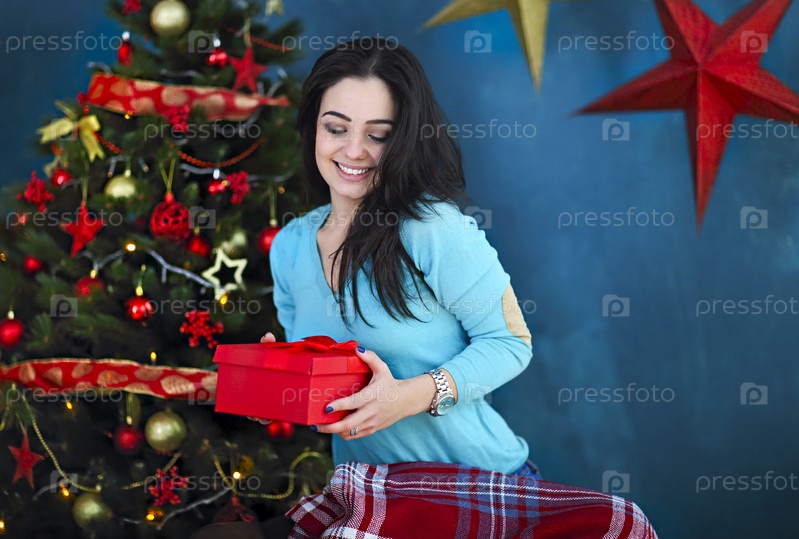Улыбающаяся счастливая женщина с подарочной коробкой над гостиной на фоне рождественской елки