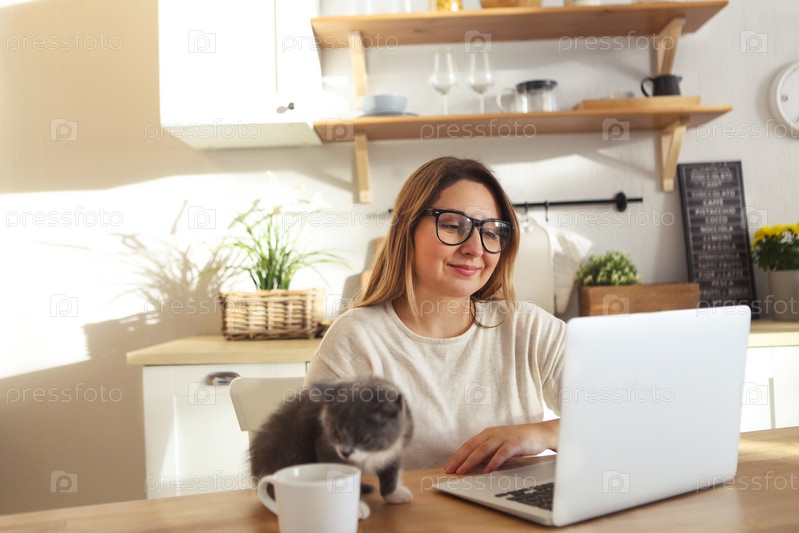 Привлекательная улыбающаяся женщина, работающая с маленьким очаровательным котенком