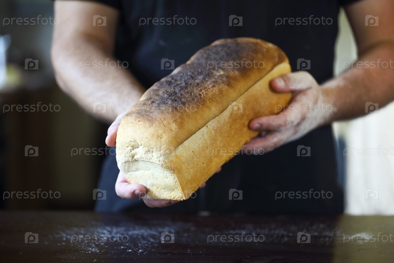 Мужские руки держат свежеиспеченный хлеб