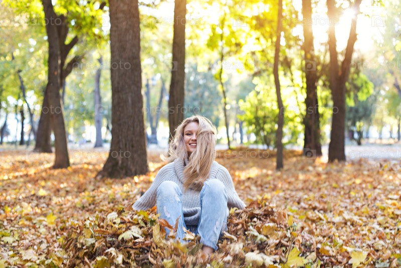 Счастливая блондинка позирует в осеннем парке на фоне желтых деревьев