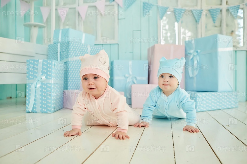 Двое детей лежат на мягкой поверхности в светлой комнате, одетые в голубую и розовую одежду. Концепция детства
