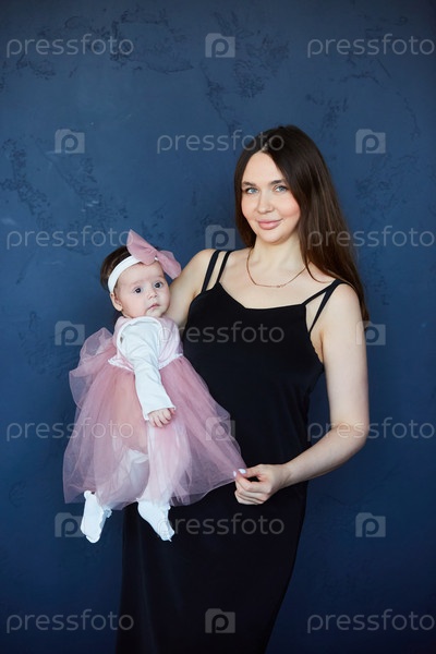 Мама с новорожденной девочкой на фоне синей стены. Понятие материнства и детства