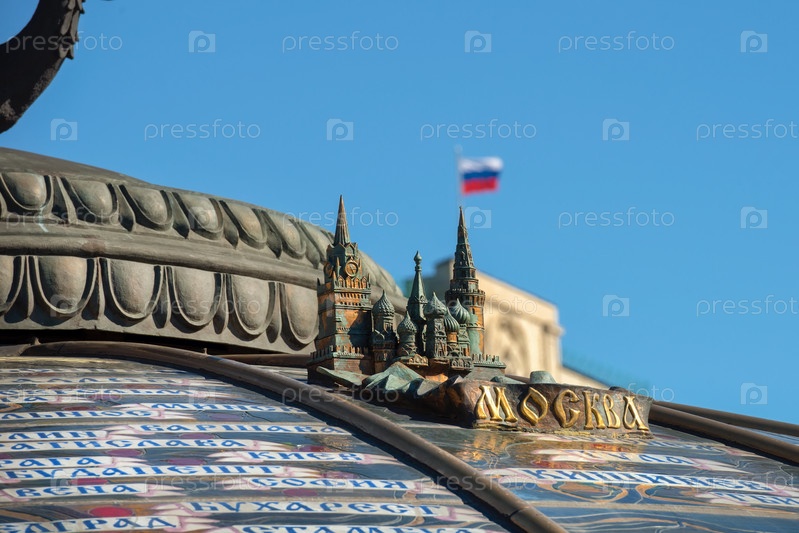 Москва, Россия-10 мая 2021 года: деталь памятника Святому Георгию поражает копьем Змея. Святой Георгий Победоносец является символом города Москвы. Башни Московского Кремля, Собор Василия Блаженного и надпись Москва