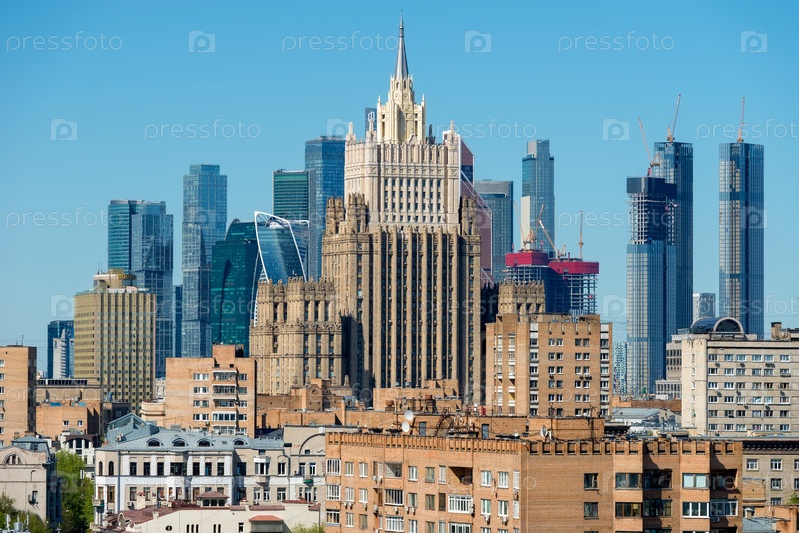 Вид на здание Министерства иностранных дел Российской Федерации и бизнес-центр Москва-Сити в солнечный день. Известные туристические места. Москва, Россия