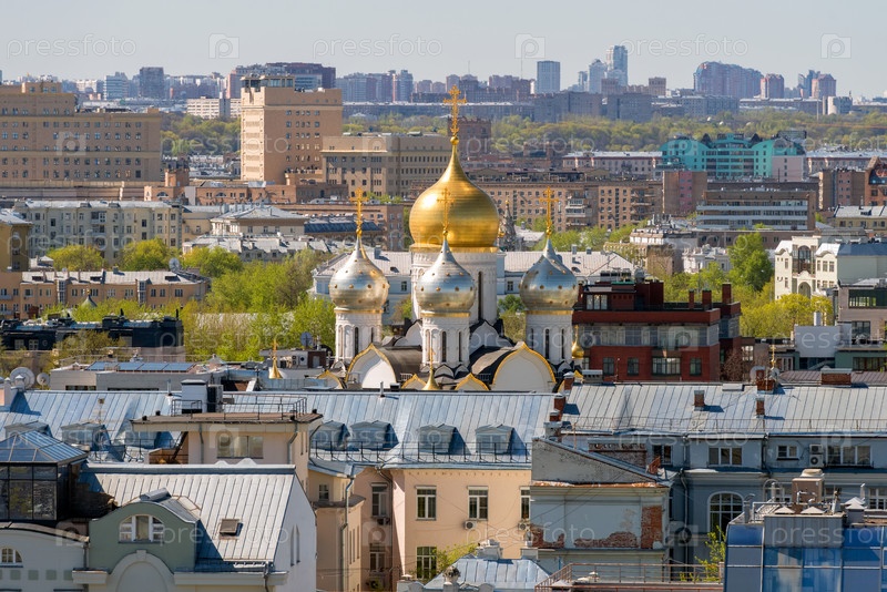 Вид сверху на собор Рождества Пресвятой Богородицы Зачатьевского ставропигиального женского монастыря и крыши жилых домов в Хамовническом районе Москвы