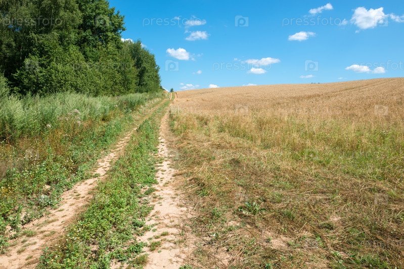 Сельскохозяйственная дорога идет вдоль поля с посевами в летний солнечный день