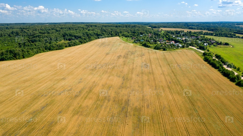 Живописный вид на сельскохозяйственное поле с зерновыми на летней ферме. Аэрофотосъемка, вид сверху с дрона. Сельскохозяйственный район Московской области. Аграрная земля в летнее время. Красота земли
