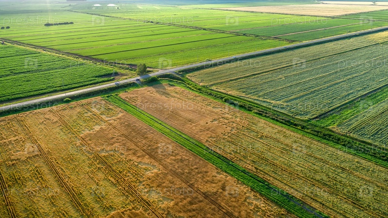 Живописные ряды сельскохозяйственных полей на летней ферме вечером. Аэрофотосъемка, вид сверху с дрона. Сельскохозяйственный район Московской области. Аграрная земля в летнее время. Красота земли